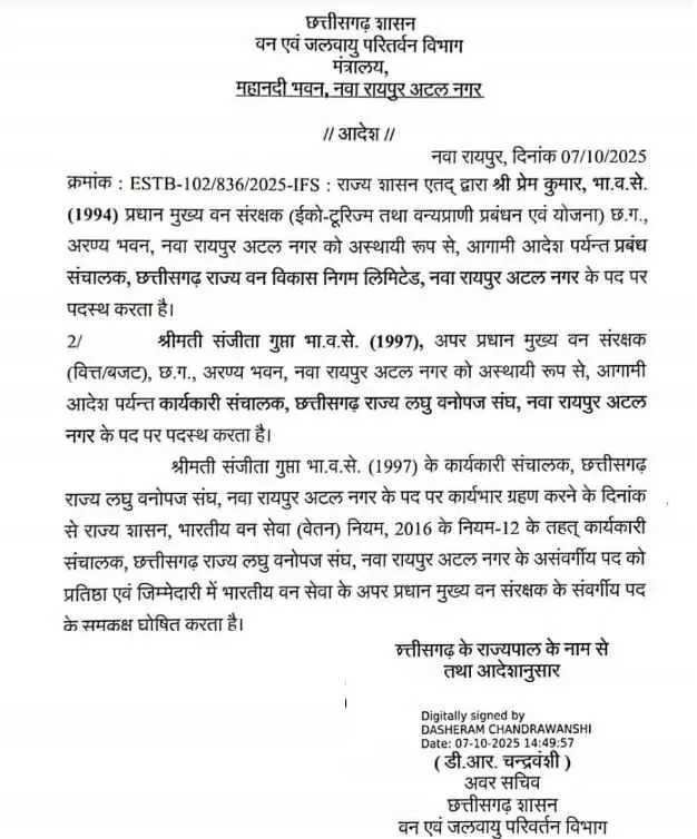 Chhattisgarh IFS Transfers :छत्तीसगढ़ में बड़ा प्रशासनिक फेरबदल: 15 IFS अफसरों का तबादला
