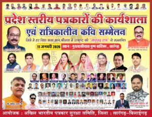 सारंगढ़–बिलाईगढ़- जिले के इतिहास में 11 जनवरी का दिन एक नई पहचान गढ़ने जा रहा है। जिले के प्रतिष्ठित गुरु घासीदास पुष्पबाटिका परिसर में आयोजित होने वाली प्रदेश स्तरीय पत्रकार कार्यशाला, भव्य रात्रिकालीन कवि सम्मेलन एवं “सारंगढ़ रत्न” सम्मान समारोह न केवल पत्रकारिता और साहित्य का उत्सव बनेगा, बल्कि समाज के विभिन्न क्षेत्रों में उत्कृष्ट योगदान देने वाले व्यक्तित्वों के सम्मान का ऐतिहासिक मंच भी साबित होगा। आयोजन को लेकर पूरे जिले और आसपास के क्षेत्रों में अभूतपूर्व उत्साह एवं ऊर्जा का माहौल है।